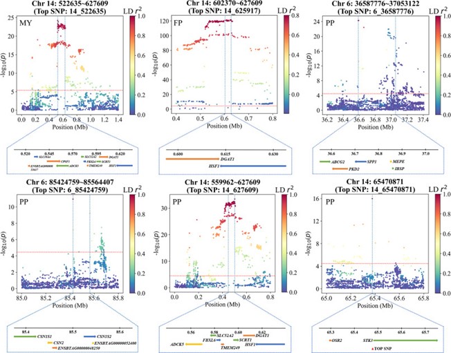 该研究以千牛基因组计划中1059头荷斯坦牛基因型为参考面板,将6470头中国荷斯坦牛的芯片数据填充至全基因组序列数据。然后,基于随机回归测定日模型使用填充的序列数据对产奶性状进行纵向全基因组关联分析。纵向全基因组关联分析共发现了与产奶量、乳脂率和乳蛋白率相关的130个QTL区域。